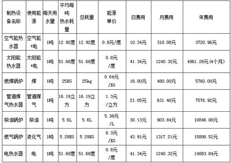 以下是各種制熱方式節(jié)能對比,按每天所需1噸55攝氏度熱水,運(yùn)行一年平均費(fèi)用表(按環(huán)境溫度平均15攝氏度):