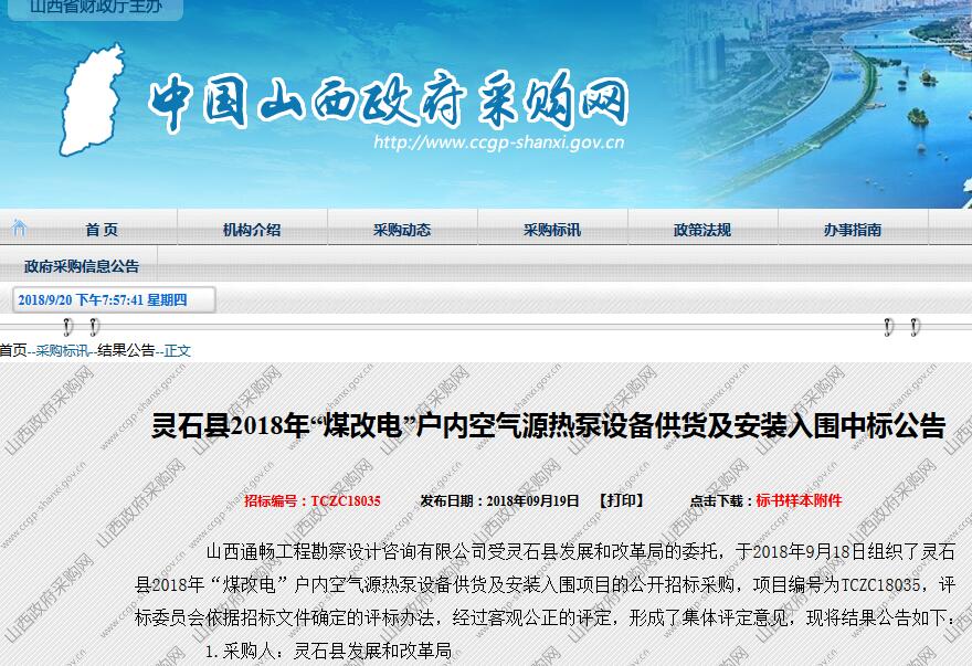 聚陽(yáng)王牌中標(biāo)山西靈石縣2018年“煤改電”空氣源熱泵設(shè)備供貨安裝中標(biāo)