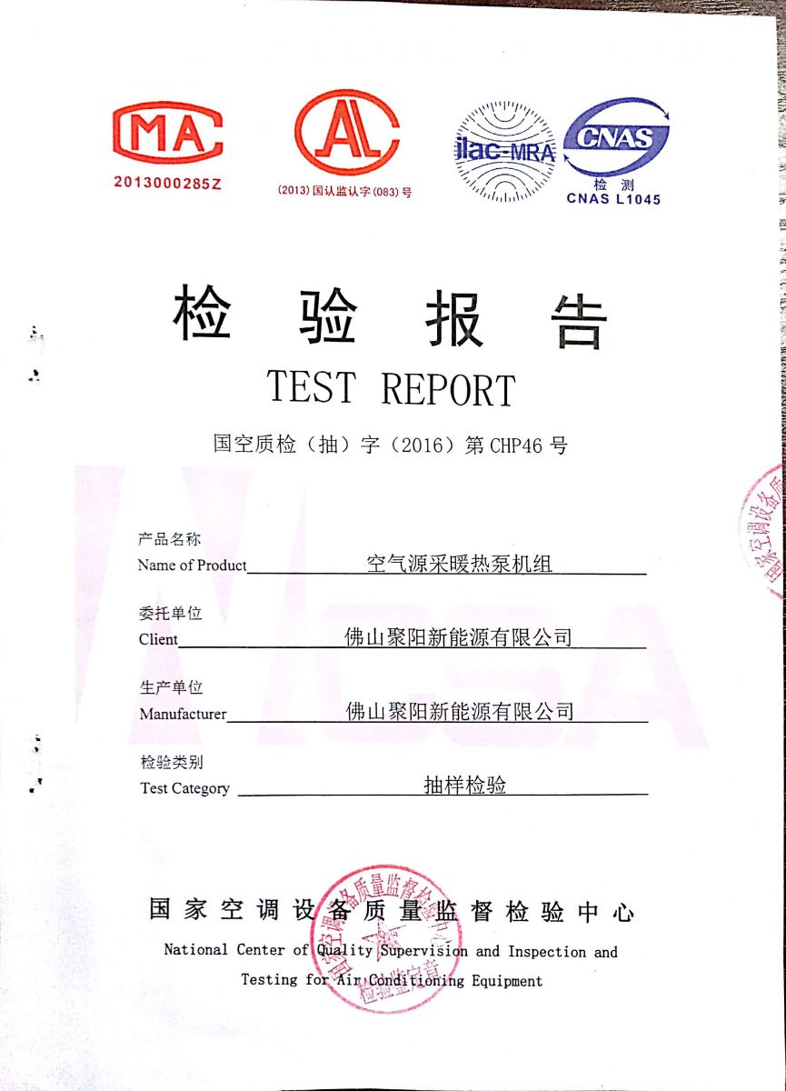 佛山聚陽新能源有限公司通過國家空調(diào)設(shè)備質(zhì)量監(jiān)督檢驗中心對空氣源采暖熱泵機組的抽樣檢驗,這為我們的空氣源采暖熱泵機組具有國家“煤改電”招標(biāo)資格提供了一個有力的證明。