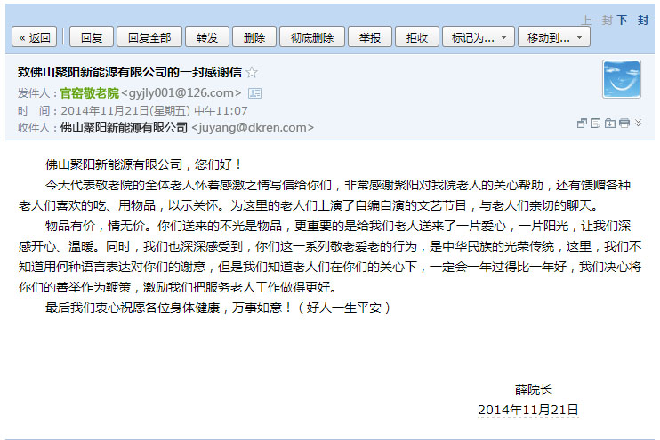 11月20日,天氣已經進入了寒意漸濃的初冬,但官窯敬老院卻是溫暖如春。因為,佛山聚陽新能源有限公司的員工滿載愛心趕來,作為“臨時兒女”陪伴這里的空巢老人,對于官窯敬老院的老人們來說,這一天比過年還要熱鬧,還 要開心。老人們生活上雖然衣食無憂,卻由于子女長期在外拼搏難以團聚,內心十分渴望家的溫馨。今天,清華王牌的工作人員帶著禮物探望他們,陪老人聊天話家常、看電影、唱歌,給老人捶背。當然讓老人感受最深的是“愛心”,面對這么多人的關心,老人連連感謝,臉上久違的笑容最終定格在“全家福”上。“與愛同行”,讓空巢老人們家空心卻不空。